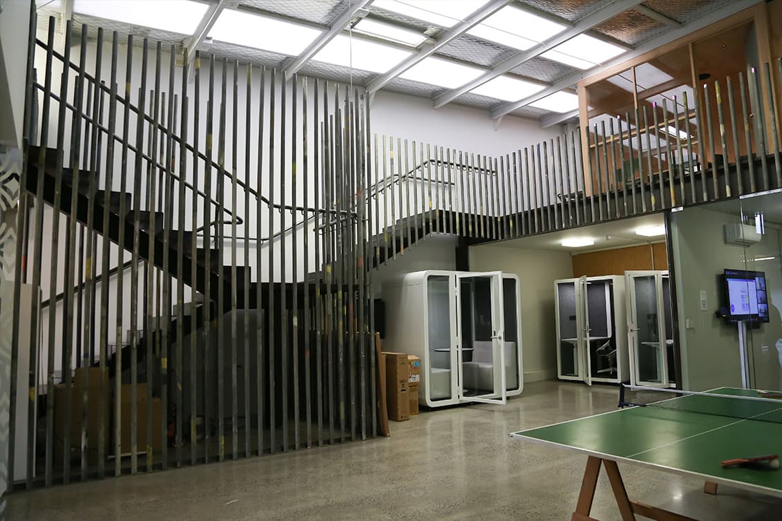The custom living wall wraps organically around the stairway architecture, creating visual impact from multiple levels while improving air quality throughout the space. Combined with strategic workplace refresh elements including modular furniture solutions and brand-aligned styling, the transformation reinforced Tracksuit’s identity as a forward-thinking company that values both innovation and employee wellbeing.